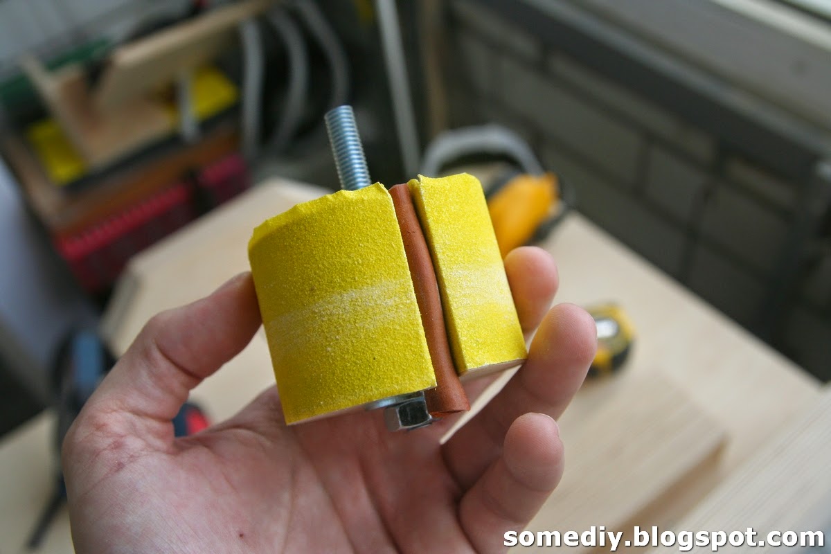 Далее рассверлил отверстия, кружки на клей, зажал гайками. Заготовки были готовы. После этого использовал такой деревянный уголок (остался после прошлых проектов), зажал руками шкурку и начал ровнять барабан.